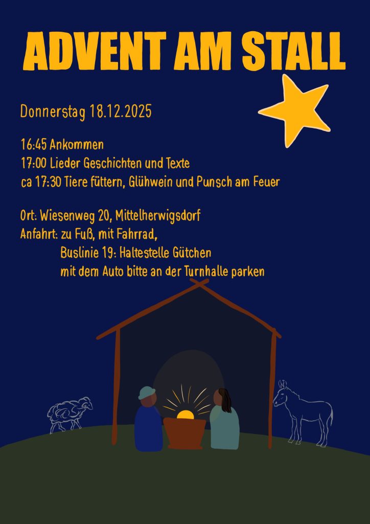 Zum Advent am Stall lädt Familie Eichhorn herzlich nach Mittelherwigsdorf, Wiesenweg 20, am Donnerstag, 18.12. 2025 ab 16.45 Uhr ein.