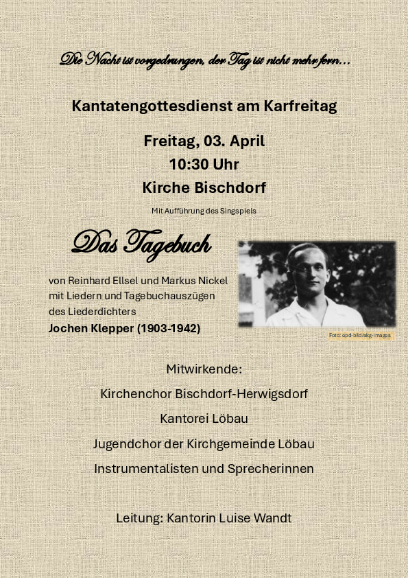 Das Singspiel „Das Tagebuch“ von Reinhard Ellsel und Markus Nickel beschäftigt sich mit dem Tagebuch von Jochen Klepper – Theologe, Schriftsteller und Liederdichter (1903-1942).