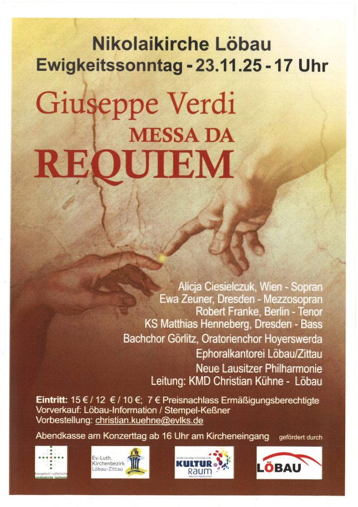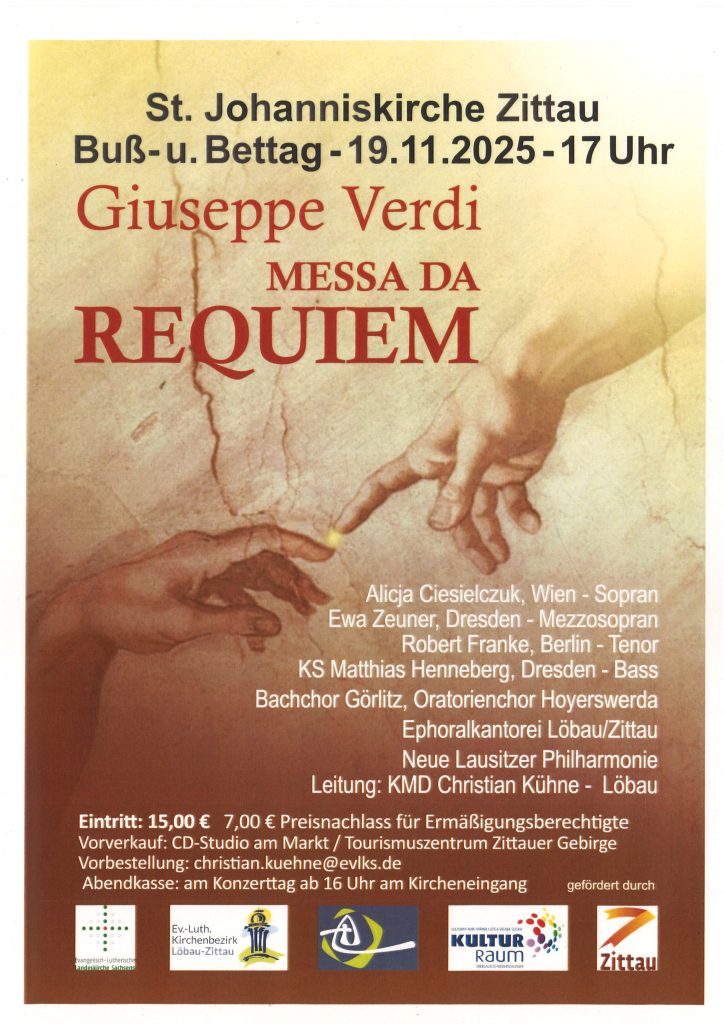 150 Jahre nach den deutschen Erstaufführungen (Dezember 1875 in Köln und in München, kurz darauf folgte Schuchs Erstaufführung in der Dresdner Semperoper) erklingt die Messa da Requiem von Giuseppe Verdi in Löbau und Zittau